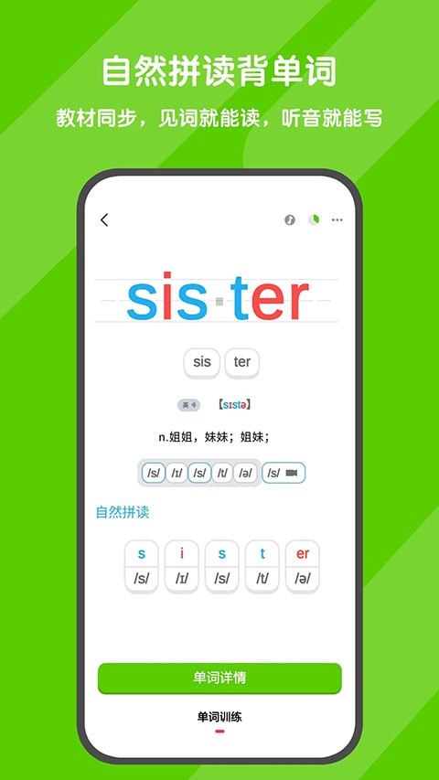 2、自动的滑动单词卡无需你手动点选。使用不同的颜色来区分单词的音节加深对单词的印象。