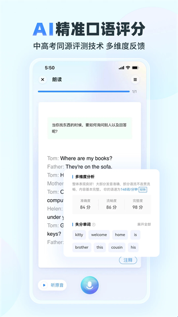 6、支持逐句模仿跟读和实时评测,可以及时的为您进行纠正,让你可以有效的提高自己的口语能力。