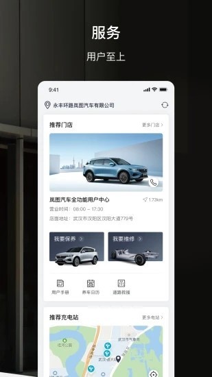 3、点开服务,这里可以看到车辆的维修保养最近的门店推荐以及车辆充电桩的地图;