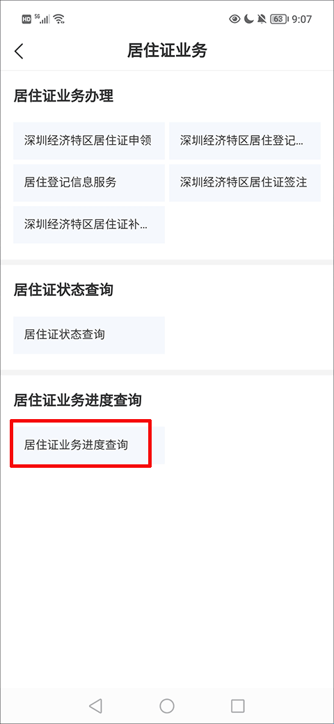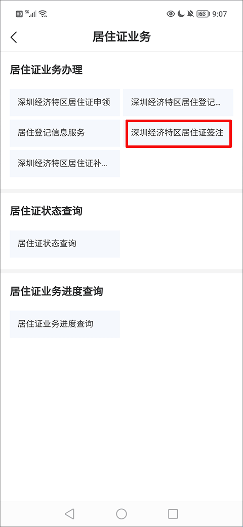 2、在居住证业务界面,找到并点击“深圳经济特区居住证签注”选项。