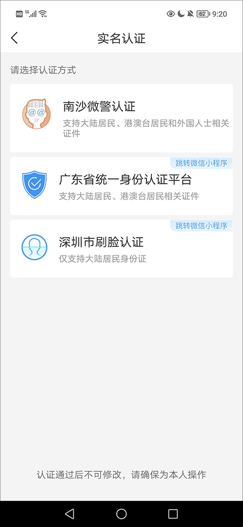 4、然后,用户需要在实名认证界面进行实名认证,认证方式有南沙微警认证、广东省统一身份认证平台、深圳市刷脸认证。