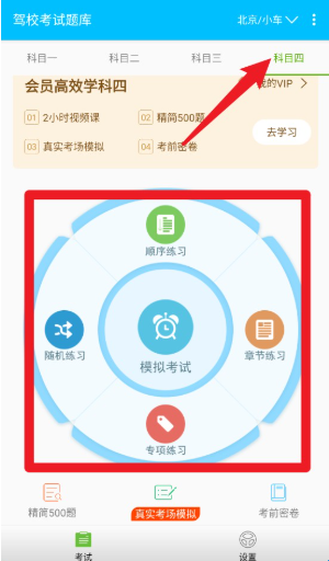 4、在科目四页面,可通过顺序、随机、章节及专项练习,多维度强化安全文明驾驶理论。