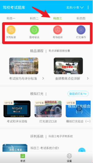 3、在科目三页面,提供评判标准、路考秘诀、考场经验及灯光操作训练,全面提升实操能力。