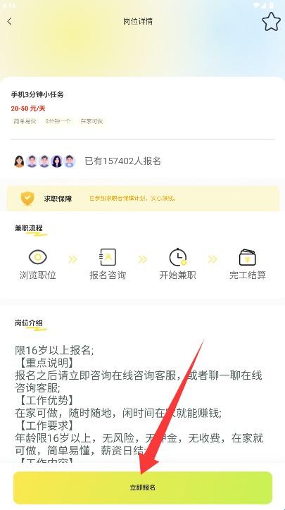 4、查看职位详细信息确认合适后,点击立即报名按钮即可申请该兼职工作机会。