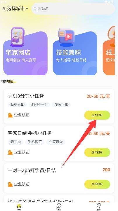 3、在首页选择目标城市,浏览系统推荐的优质兼职或通过搜索查找心仪岗位。
