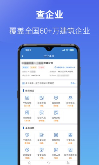 首页点击“查企业”,输入企业名称或关键词,查看中标业绩、资质等级、工商信息、法律诉讼等。