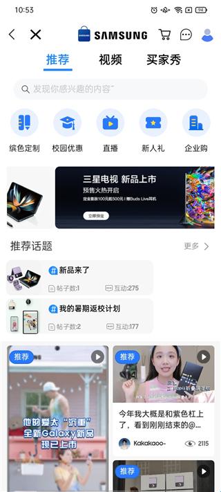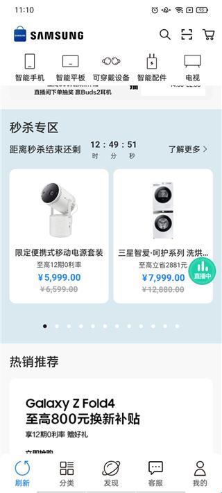 1、在首页中我们查看三星旗下各种智能设备,下方还有秒杀专区。