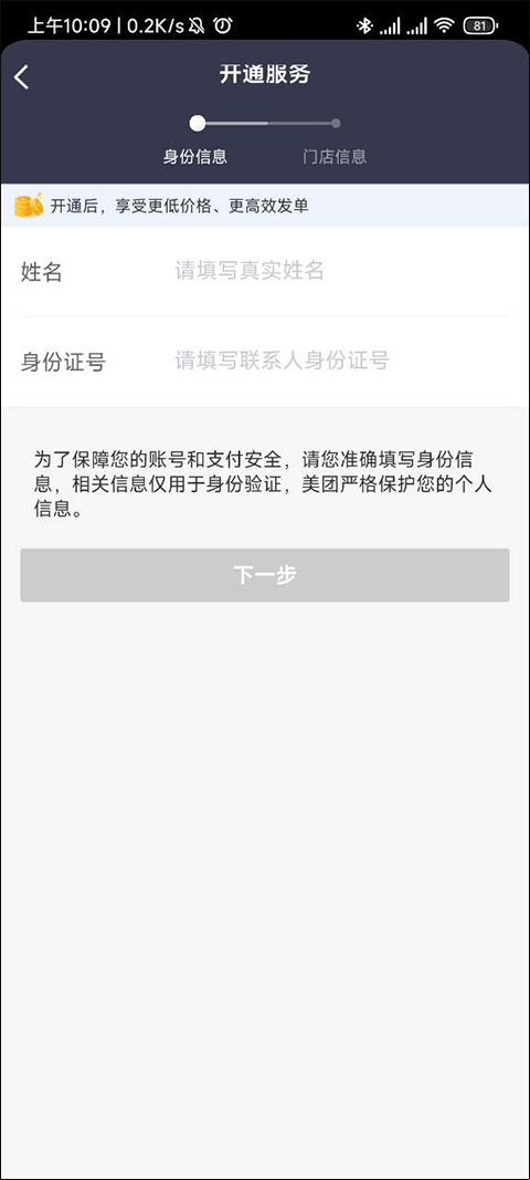 3、这个时候就会跳出让我们开通服务的界面了,我们需要输入自己的名字和身份证就可以进行下一步了。