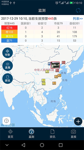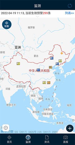 2、切换到【监测】页面,我们还可以查看当日国内的所有生效预警信息,点击右上角还可展开列表。