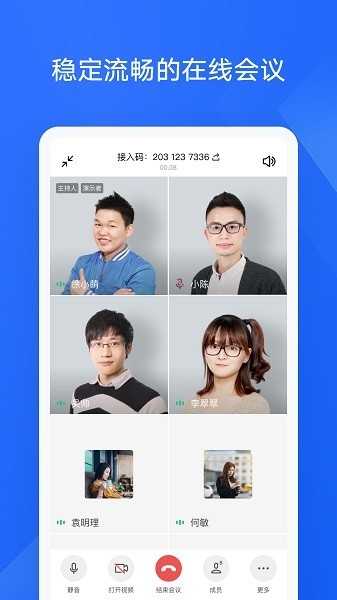 5、聊天中一键入会,会议中文档共享、同步协作,高清视频通话、安全稳定流畅