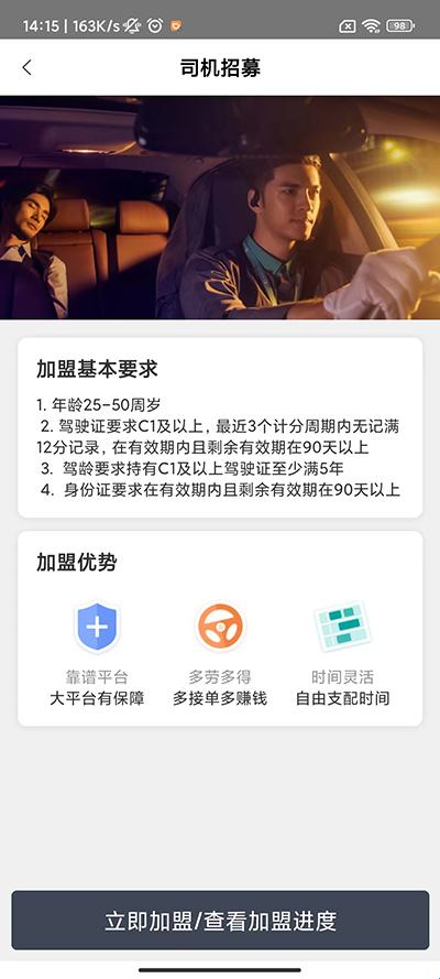 3、进入司机招募界面,这里提供了最基础的加盟要求,符合要求点击立即去加盟即可。