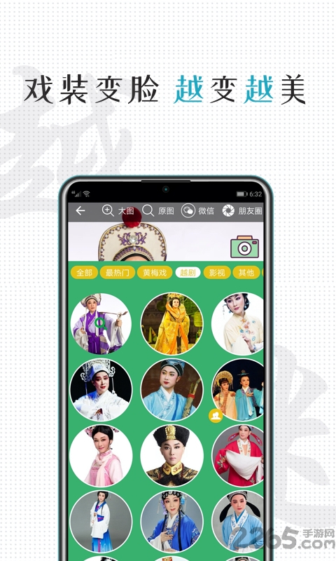 (3)趣味戏装换脸功能,一键 P 图将自己的照片与戏曲名家照片合成,秒变戏中人。2265一键分享自己的戏装扮相惊艳朋友圈。