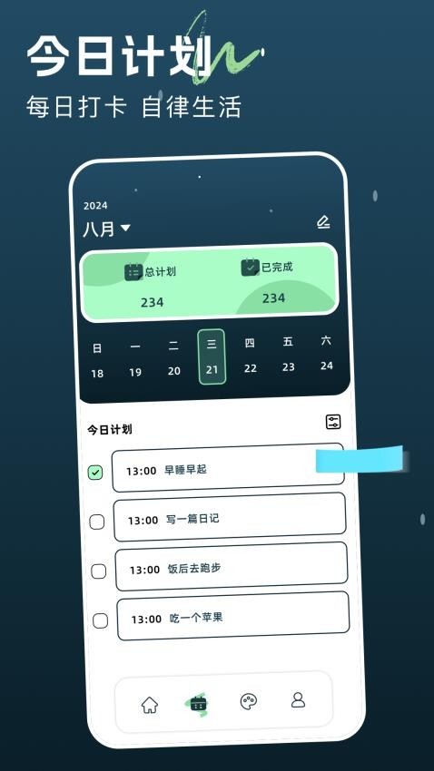 5、自律生活:添加今日计划自律打卡完成计划,可以助力用户开启健康自律的生活模式。