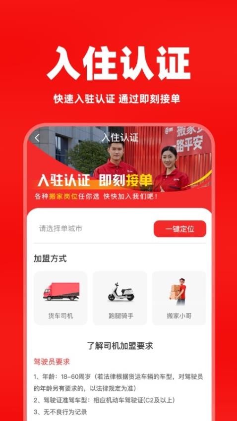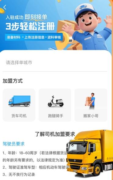 1、最开始需要司机朋友完成注册认证,可以选择成为货车司机或者搬家小哥,查看你所在的城市有开通么,接着填写资料完成申请就可以了。