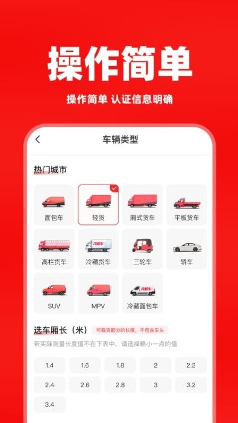 1、车辆类型:展示了多种车辆类型的认证,找到匹配的车型就可以一键认证,实现搬家货运的认证。