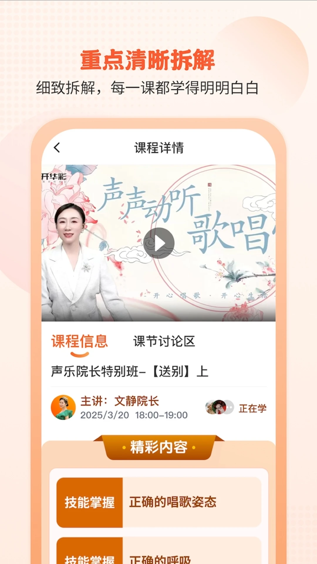 3、专业老师系统拆解:名师真人出镜讲解,从气息、共鸣到情感处理,重难点逐句拆开讲,配合示范演唱和讲评,帮你一步步搭好声音基础。