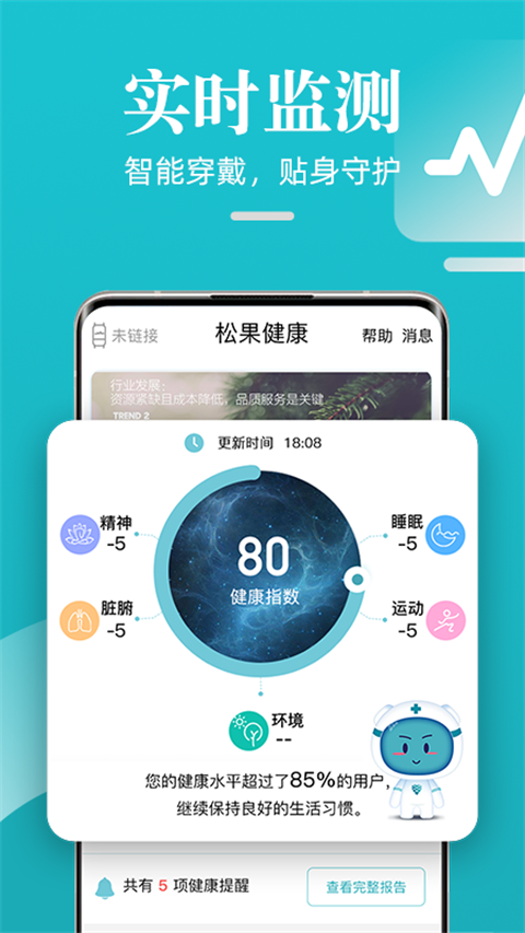 松果健康是一款非常好用的手环健康记录app,用户使用手环就可以在软件李米娜看到最新的身体检测数据,随时随地的保护和检测用户的身体健康为用户健康作保障,帮助用户一键测试检查自身的脏腑状态和心率等身体参数,充分了解自己的最新的运动数据,心率,睡眠数据等信息,并对用户健康生活提供可靠的建议。