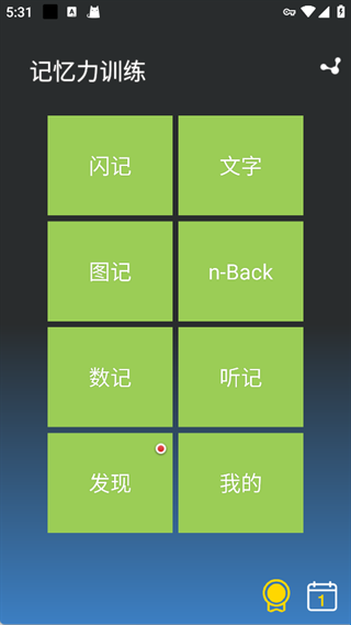 1、打开记忆力训练App,在首页有闪记、文字、图记、n-Back、数记、听记等多种训练类型。