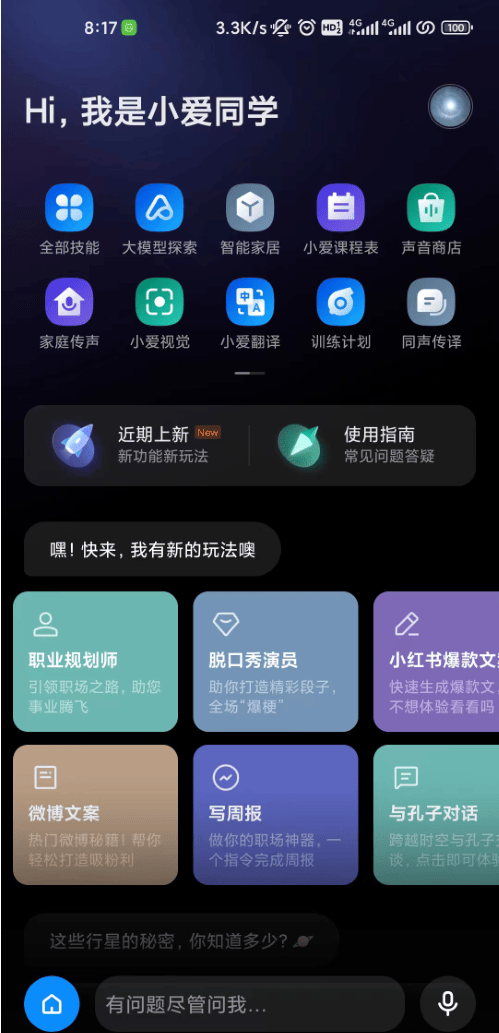 3、唤醒后就可以进行使用,比如其超级拟人音色功能可以像真人自然交互对话,例如你可以直接问它你能做什么。
