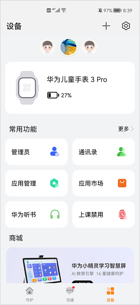 1、在智能关怀应用右上角+,如果儿童手表未绑定主管理员,则根据儿童手表提示扫描二维码进行绑定;如果儿童手表已经绑定主管理员,进入儿童手表应用列表,点击二维码,扫描二维码后,待主管理员同意后即可绑定成功,管理多台儿童手表时,在智能关怀应用中点击设备,点击页面上方儿童手表头像可以进行切换。最多可以绑定10台儿童手表(仅支持绑定华为、荣耀品牌的儿童手表)。