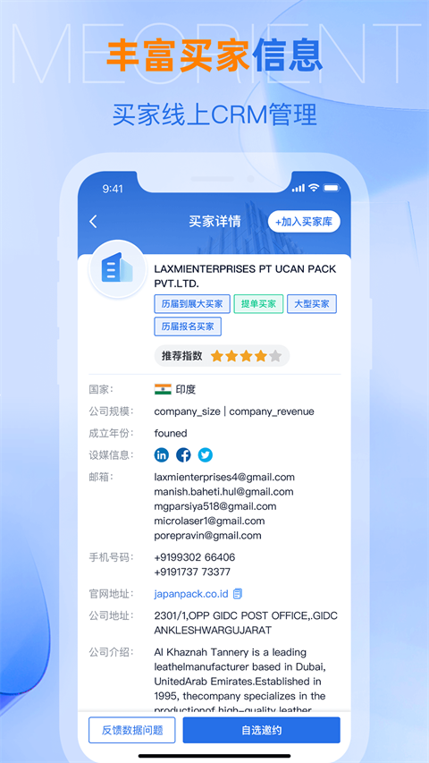 基于买家画像、买卖双方对接数据、买家评价等内容,通过米奥AI算法智能持续推荐优质、精准匹配的买家,节约展商获客成本,优质潜客识别更精准!