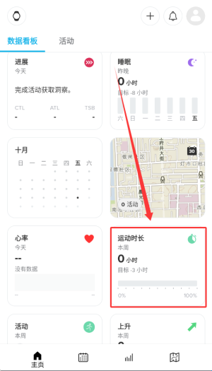 3、主页面实时展示累计运动时长与近期锻炼数据概览信息。