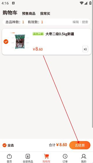 6、购物车结算:选购完商品之后,就可以进入购物车页面,点击右下角的去结算,提交订单。