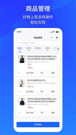 3、【商品管理】支持上下架商品、调整价格库存、修改详情等商品管理操作