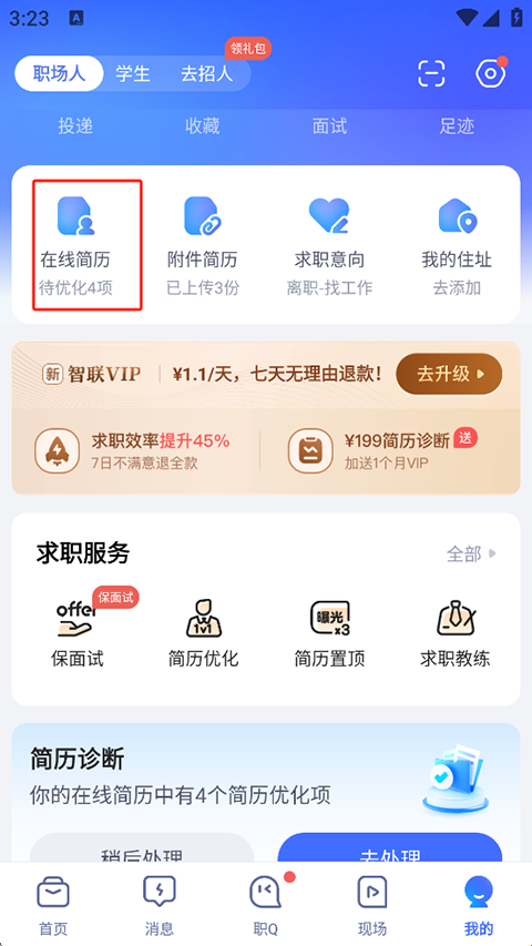 1、打开智联招聘APP,点击右下角“我的”-“在线简历”。