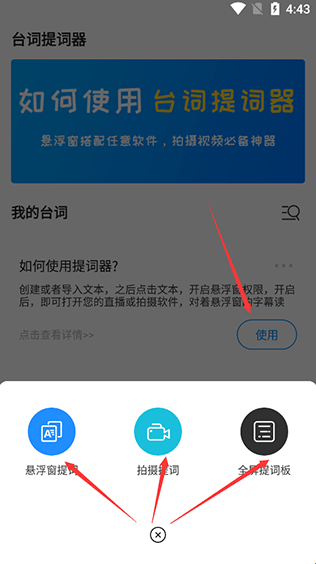 3、开启后,点击使用,弹出提词悬浮窗,由于悬浮窗置顶显示,打开任意拍摄软件即可看到悬浮窗台词;