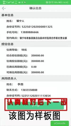 3、进入签约:客户信息(基本信息、授信信息、共同债务人等)展示,核对无误后点击“下一步”进入服务告知书。