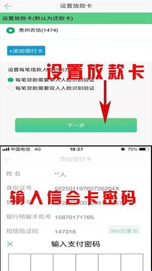7、人脸核实通过,跳转【设置放款卡】:后台将自动查询您绑定的信合卡显示在页面,且可点击【添加银行卡】按钮添加新信合卡,设置每笔借款人脸识别的方式。