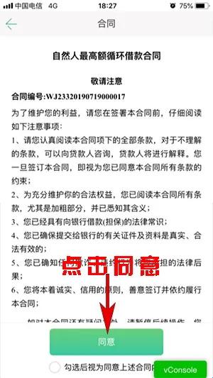 8、确认《自然人最高额循环借款合同》合同信息,可查看借款相关信息:借款人姓名、身份证号码、签约日期、合同履行地等,核对无误后点击“同意”。