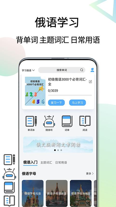 1、俄语词库:俄语有声词库练习,符合人类遗忘曲线规律的智能学习模式。