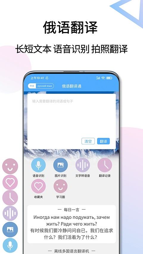 俄语翻译通是一款非常好用的翻译软件,这款软件的功能十分强大,支持俄语、汉语、英语等多种语言的互译,无论是词语、句子还是短文等都可以翻译,不仅速度快,翻译准确度也非常高,无论是学习外语还是出国和外国友人交流都可以,有需要的朋友快来下载体验吧。
