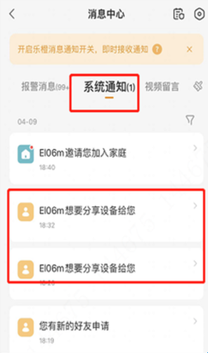 3、然后会有一个等待同意的提示,需要对方登录乐橙,点开消息-系统通知里接受即可