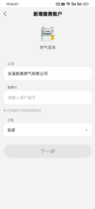 3、选择所属燃气公司,并输入用户编号,确认无误后,点击「下一步」(用户编号可查看纸质缴费账单哦~)。