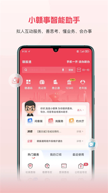4、智能客服"掌上答":提供智能问答互动服务,并将江西12345政务服务热线统一受理、转办、督办,营造有温度的人机交互式办事体验。