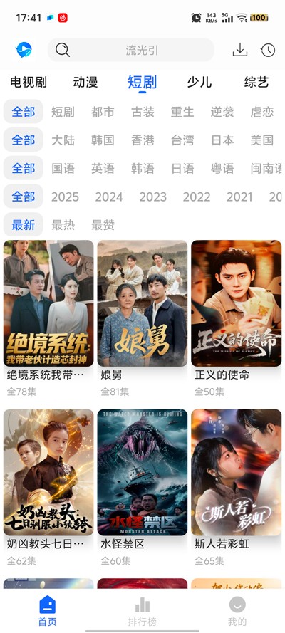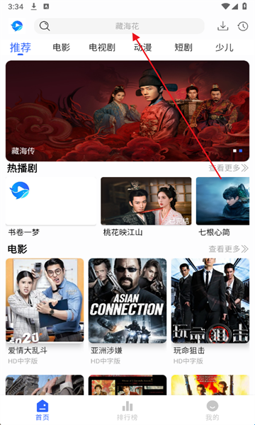 1、下载并打开软件,点击上方搜索,搜索自己喜欢的影视剧