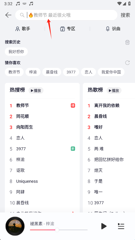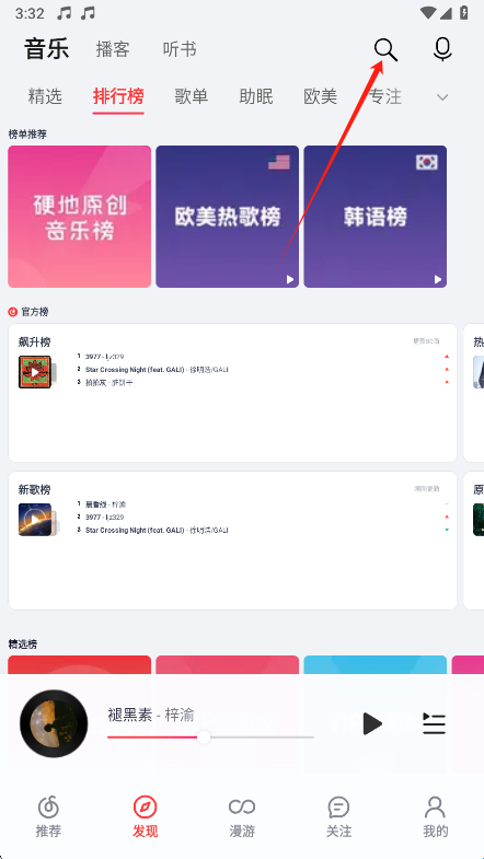 1、我们首先要搜索自己想听的歌曲,点击右上角的放大镜搜索按钮就可以了。