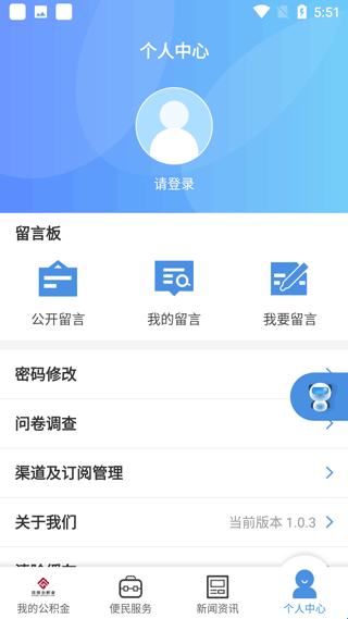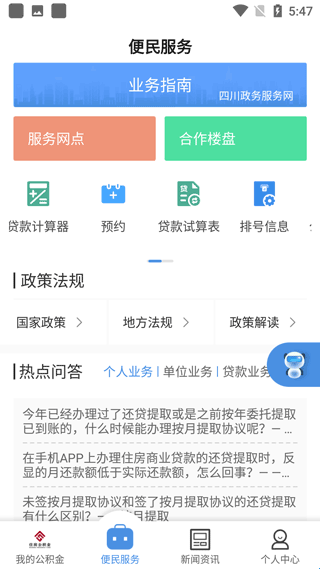 5、便民服务:新闻动态查看缴存地公积金中心的政策解读、业务指南和中心文件信息。并提供服务网点查询、房贷计算器等公积金服务。