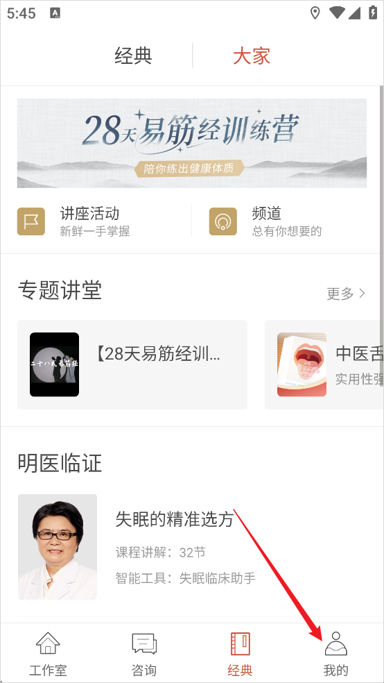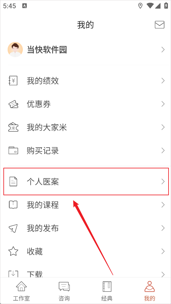 1、打开大家中医App登录医生账号,点击底部导航栏“我的”进入“医生工作室”页面。