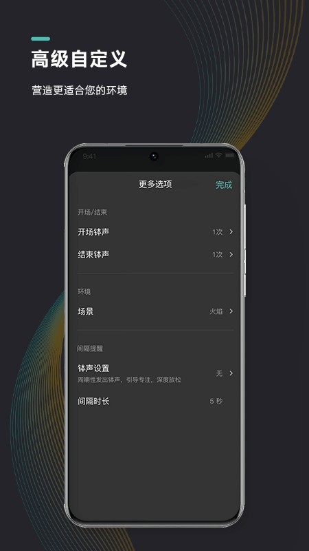 2、【计时器】一个好的定时器可以让周期内的效果事半功倍,App的计时器提供了6大实用的的自定义选项:自定义开始时、结束时的提醒声音,包括播放次数及震动,能量钵的声音助你迅速进入状态;自定义场景声,5种经典白噪声,无论睡眠、放松,还是学习、工作,够用就好,无需纠结;间隔提醒,如果你希望在专注状态下仍感受到时间流逝,你可以设置每隔多久就提醒你一次。