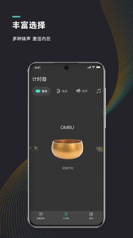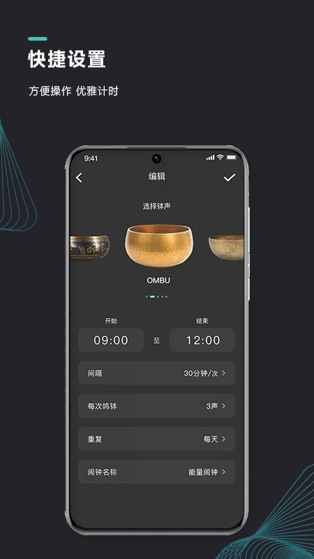 3、【能量闹钟】拥有自己的时间密码,建立个性化的报时方案,并可以自由切换;让颂钵的能量之声成为你的报时声音;高度自定义:整点报时、半点报时、番茄报时法、自定义报时时限。