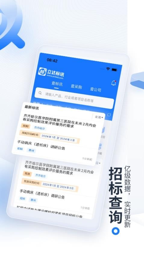 立达标讯app是一款便捷高效的招投标资讯信息服务应用软件,在这里能够对众多行业中的招投标的信息查询,可以适用于更多的招投标查询的使用场景,并且可以对众多的对手企业进行实时监控,准确把握对方的所有动态信息,获得更优先的多方面信息。