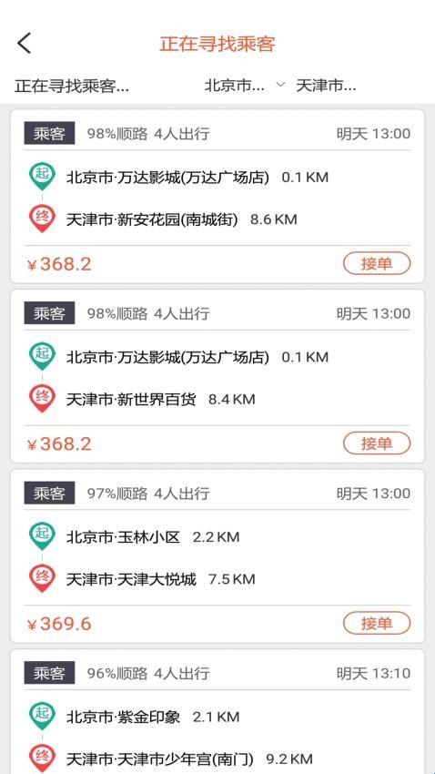 2、订单列表:实时更新周边的出行需求订单,点击即可查看详情进行订单领取。