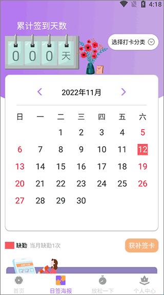 1、首先,打开今日打卡app,在日签海报中找到并点击“获补签卡”按键。