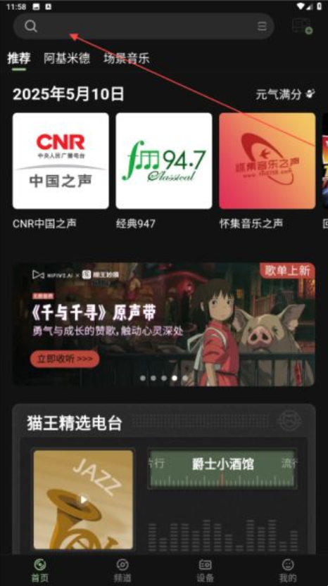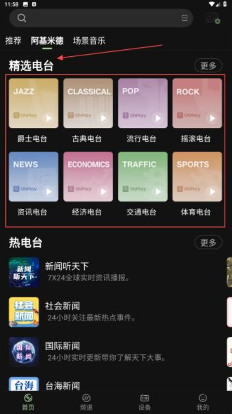 2、在【精选电台】区域点击【爵士电台】【古典电台】等图标可收听对应类型电台。