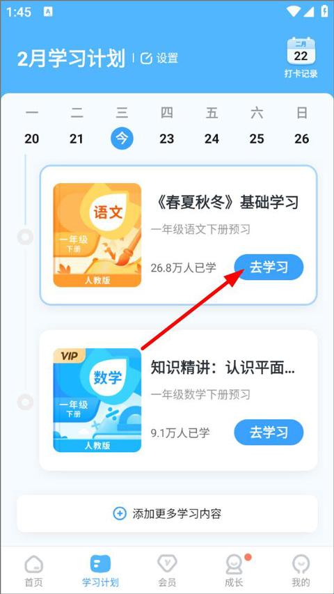 3、打开学习计划页面,用户可查看当天学习计划,点击去学习。