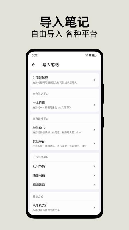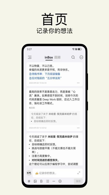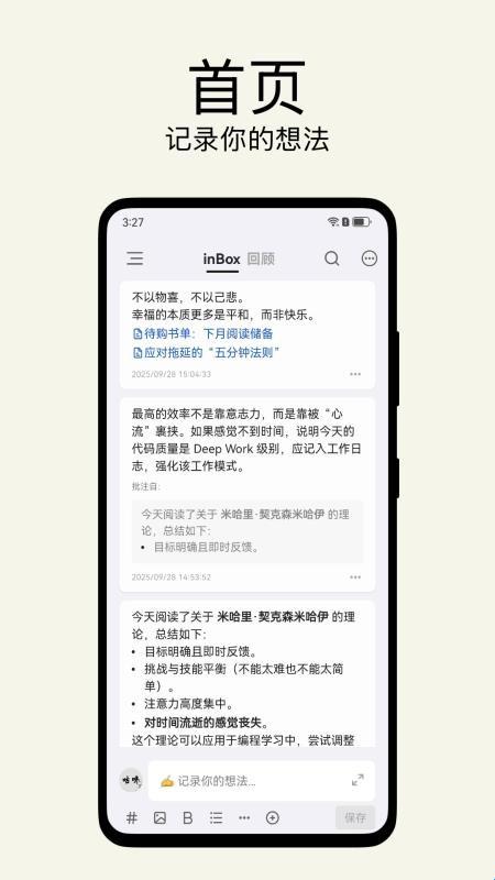 2、快速的输入体验,打开即写作,本地化操作,灵活的组织方式,用标签替代分组,支持多级标签,如 App/inBox更好的组织碎片化内容。